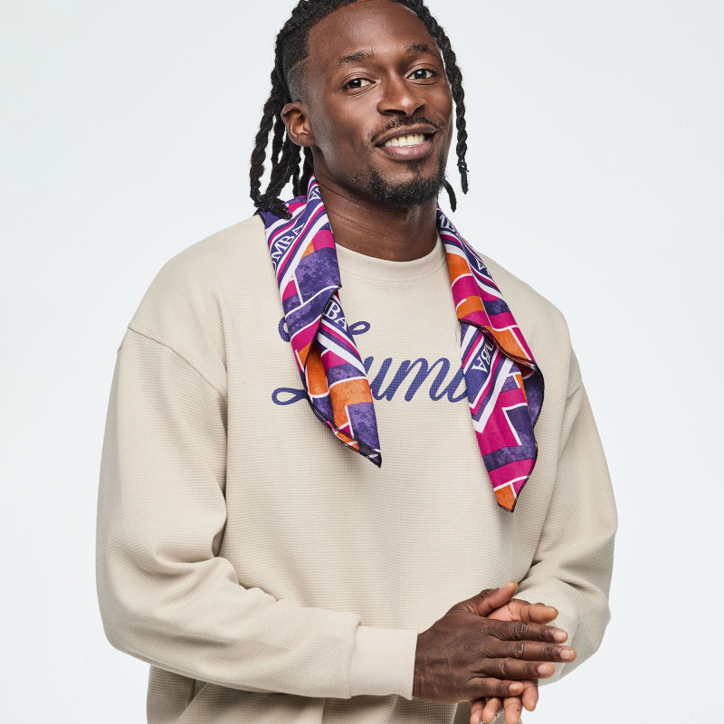 Bandana #2 showcases an emblematic all-over print background, centered with a bold script "Zumba" adorned with a multicolor drop shadow, making it a standout accessory for any outfit.