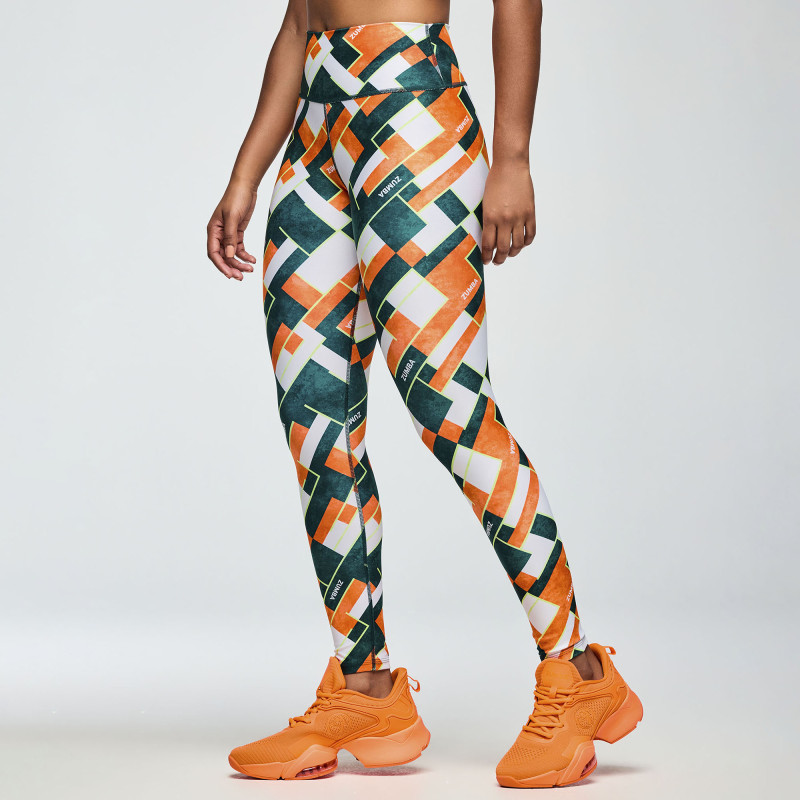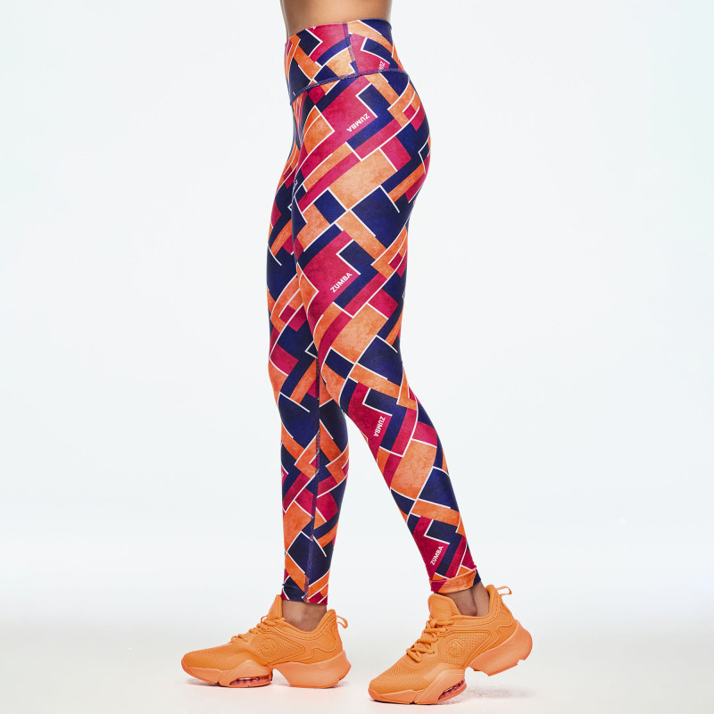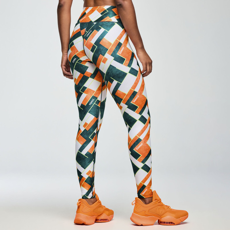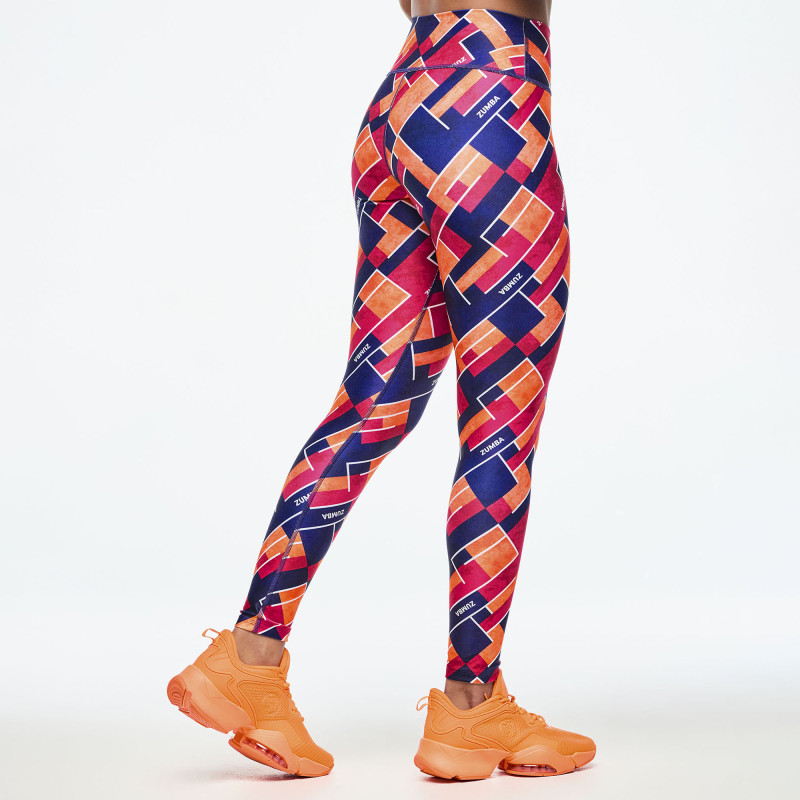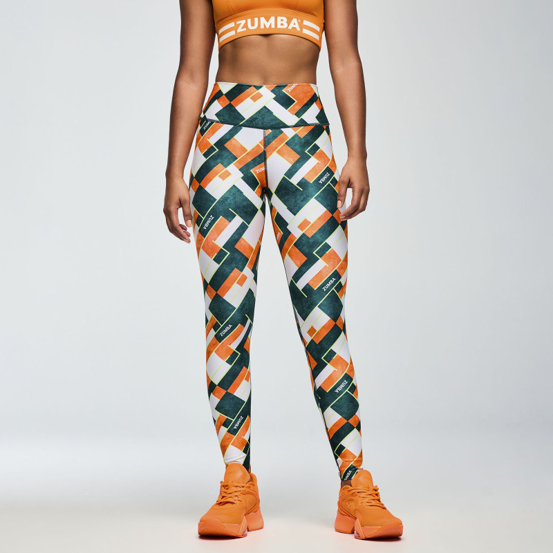 The high waistband provides exceptional support without the discomfort of internal elastic, allowing for a smooth silhouette that flatters every body type. With a 26" (66 cm) inseam, these leggings are tailored to provide a sleek and stylish ankle length that pairs beautifully with any activewear ensemble. The unique all-over print, exclusive to Zumba, adds a vibrant touch that sets you apart, making these leggings not just a workout essential but a fashion statement.