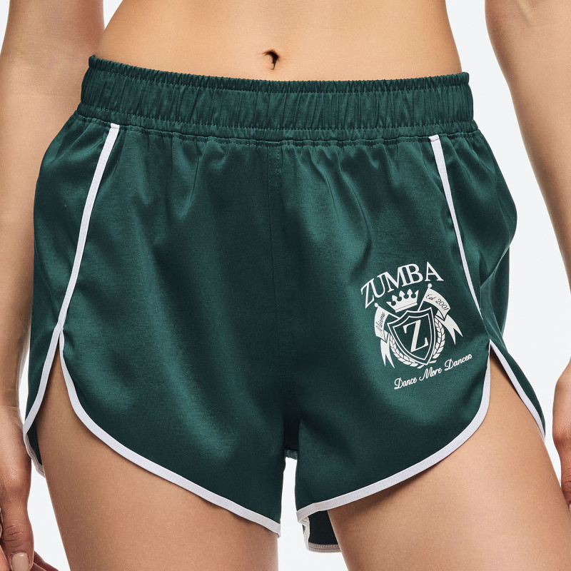 Adding a touch of flair, the contrast binding along the side and leg opening elevates the overall aesthetic, while the Zumba-exclusive graphic on the leg showcases your unique style and passion for fitness.