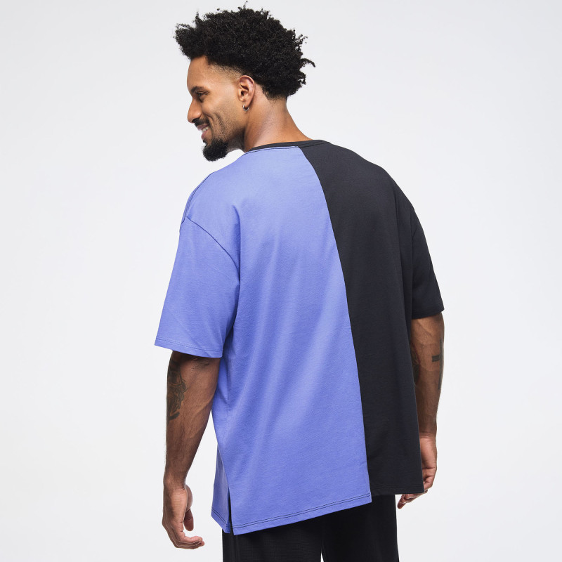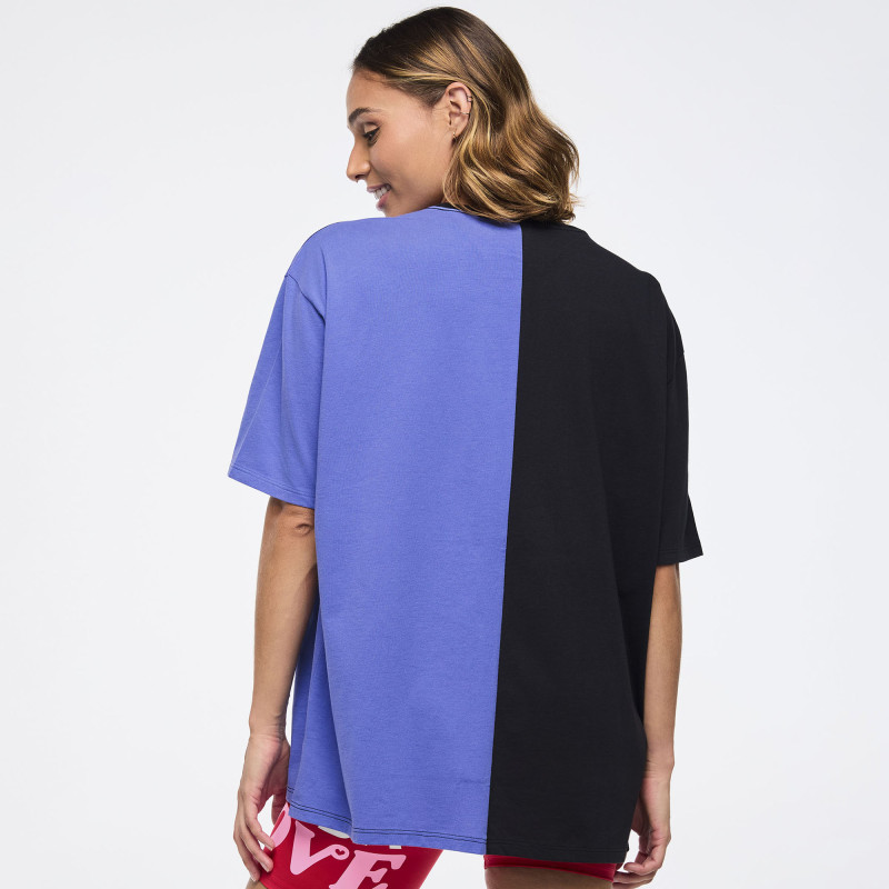 This oversized silhouette features a striking two-tone design that adds a contemporary flair to your activewear collection. The seam down the center front not only enhances the visual appeal but also creates a flattering shape that complements various body types. The rib knit collar provides added durability and comfort, ensuring that this tee maintains its shape wear after wear.