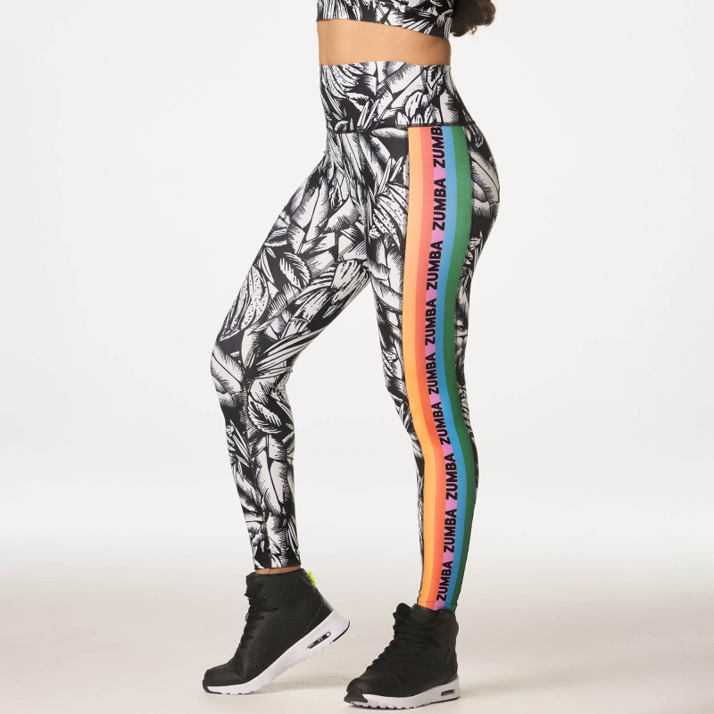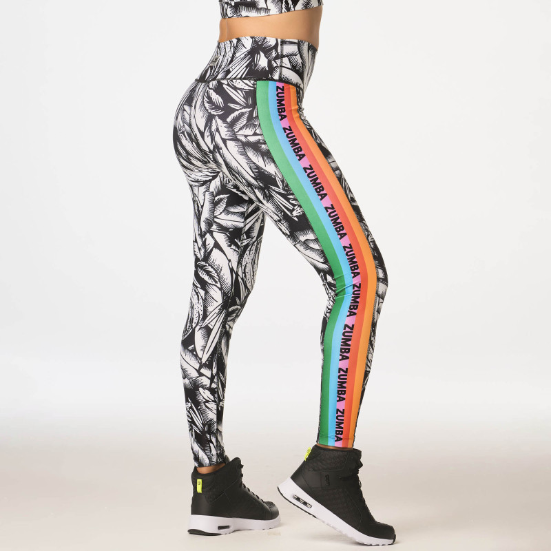 Show your Zumba love in the Zumba Summer High Waisted Ankle Leggings. Crafted from sweat-wicking fabric with bold graphic side inserts.